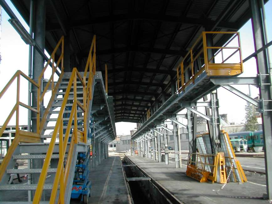 Gångbryggor utformade för säker åtkomst till järnvägsfordon vid service, inspektion och underhåll. Konstruktionen ger stabil arbetsplattform med integrerat fallskydd för arbete på höjd. Finns som fasta eller mobila lösningar och kan kundanpassas efter fordonstyp, arbetsprocess och depåmiljö.